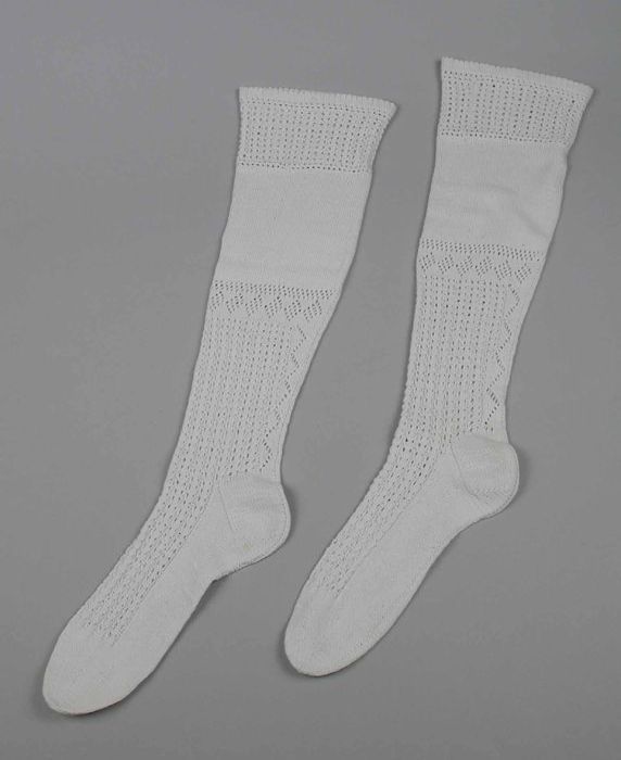 Paar lange witte kousen van katoen in ajour gebreid
