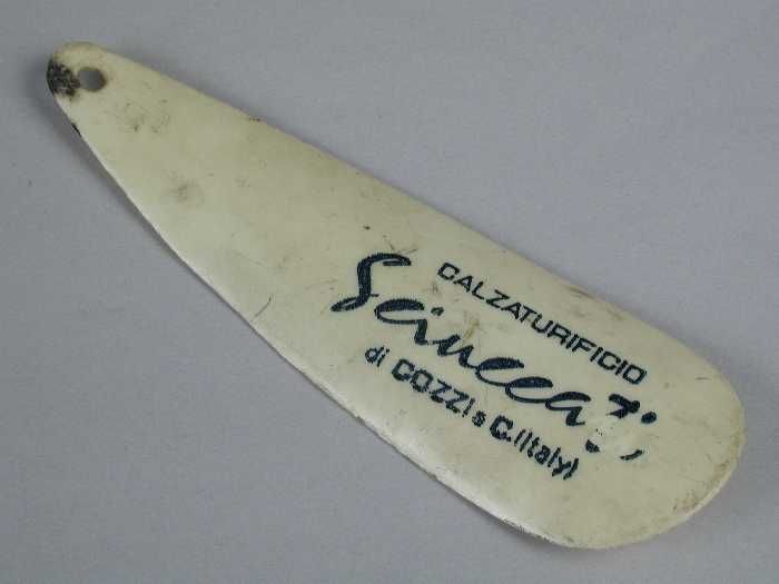 Witte kunststof schoenlepel met donkere tekst "Galza...