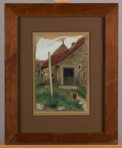 Schilderij (Gouache) Boerderij met kip, Hoorn Tersch...