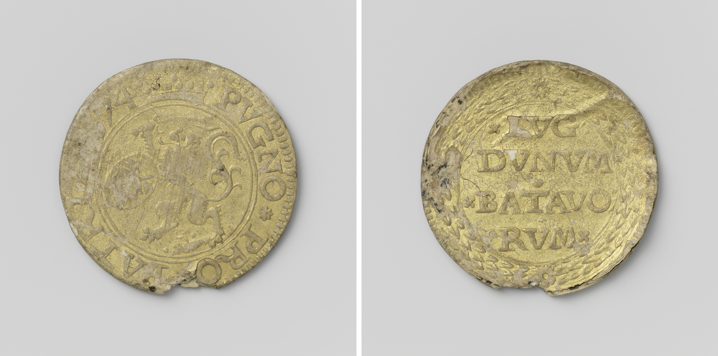 kwart gulden; verguld papieren noodmunt uit Leiden, ...