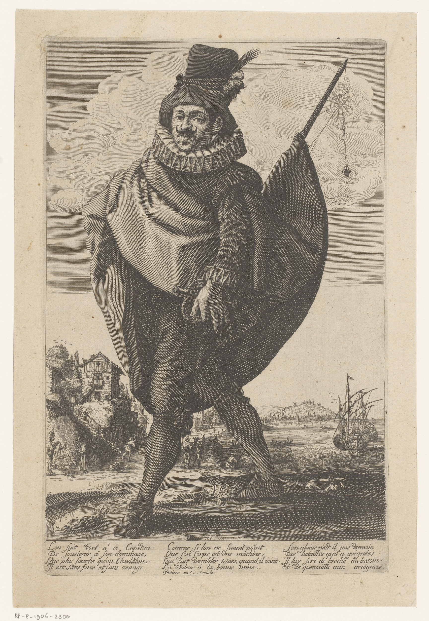 Karikatuur van een Spaanse kapitein aan wiens zwaard...
