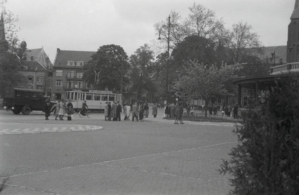 Een foto van mensen op het Velperplein in Arnhem. Ee...