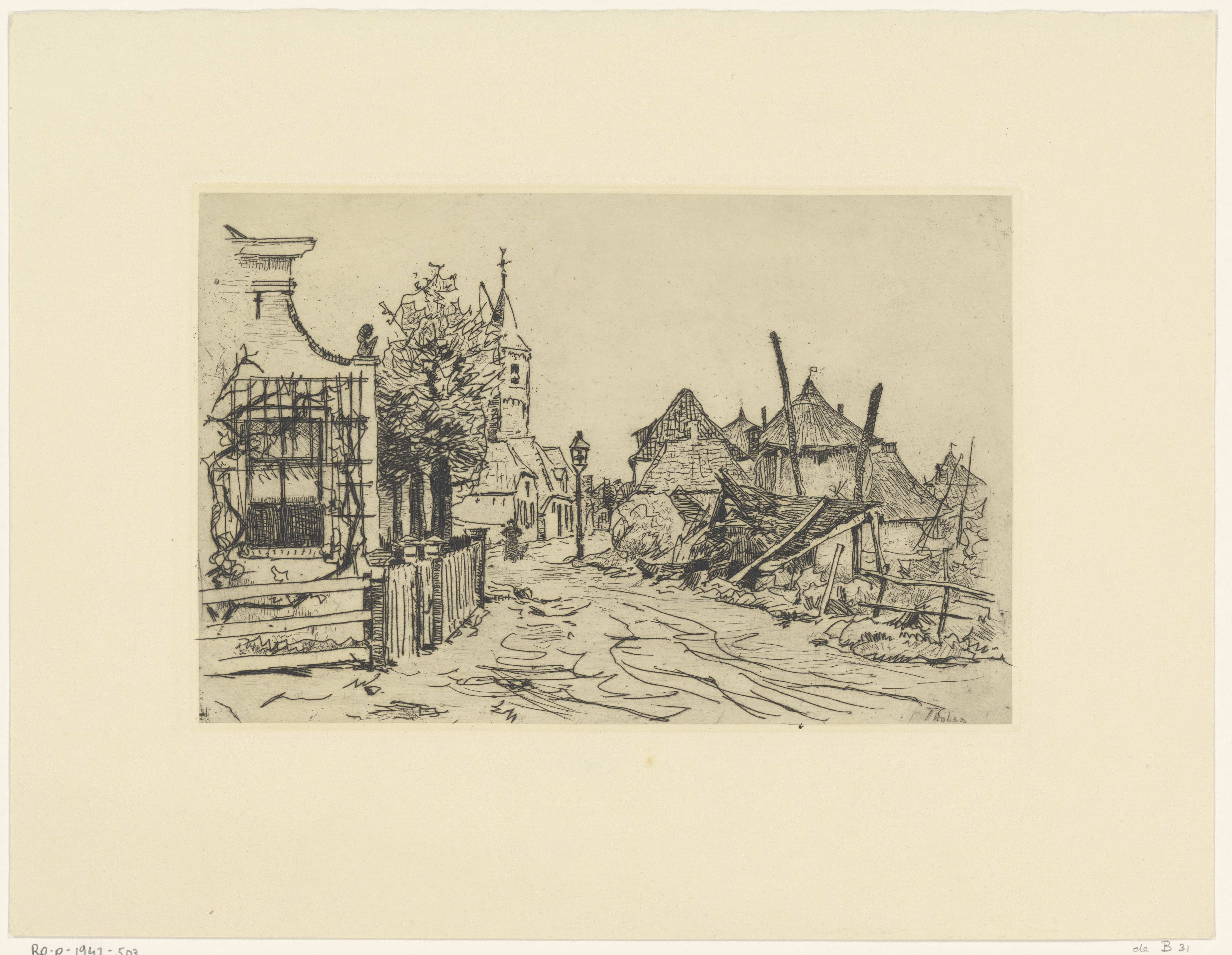 Dorpsstraat met huizen, kerktoren en hooiberg