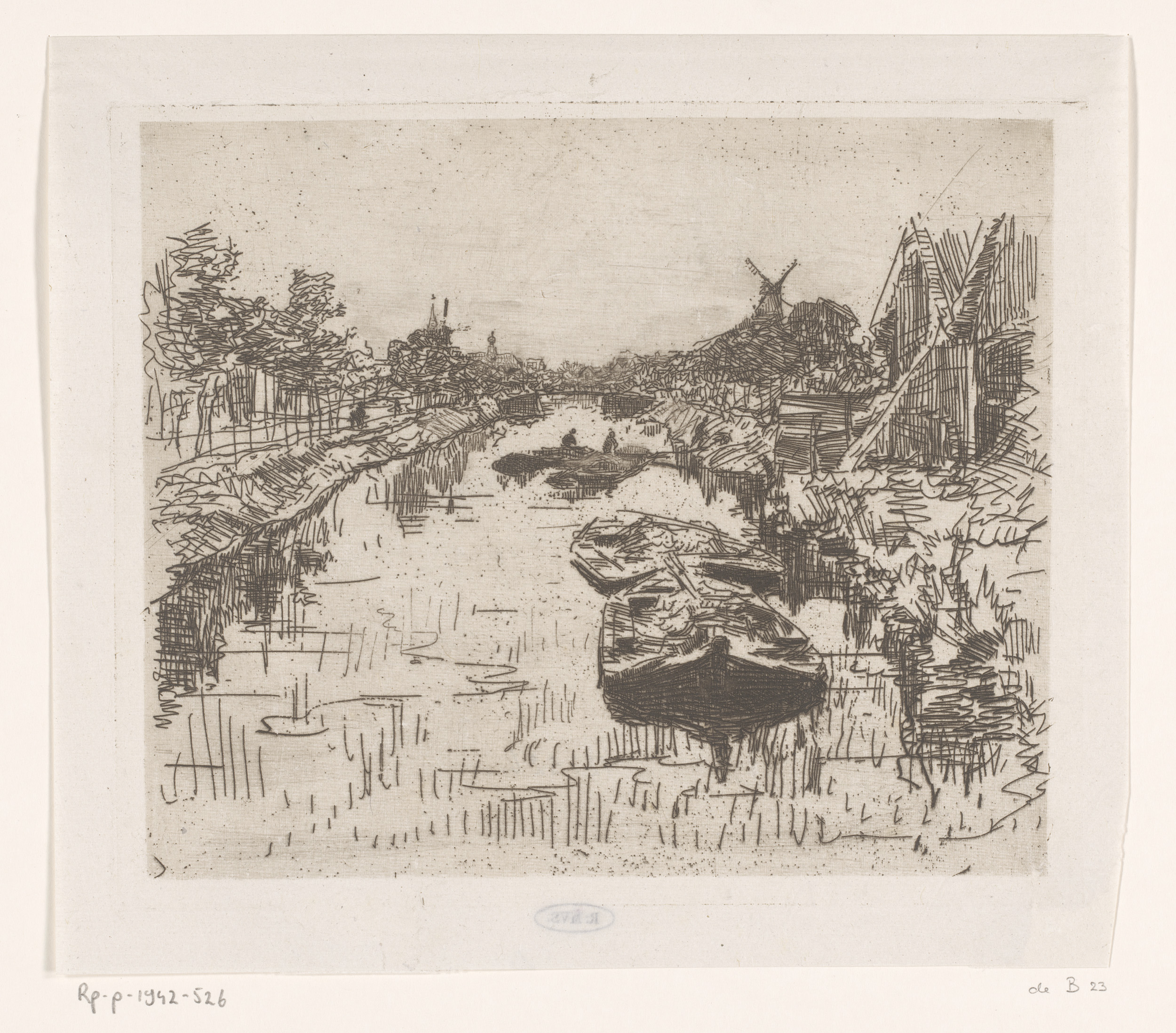 Sloot met schuit, daarachter bomen en een huis