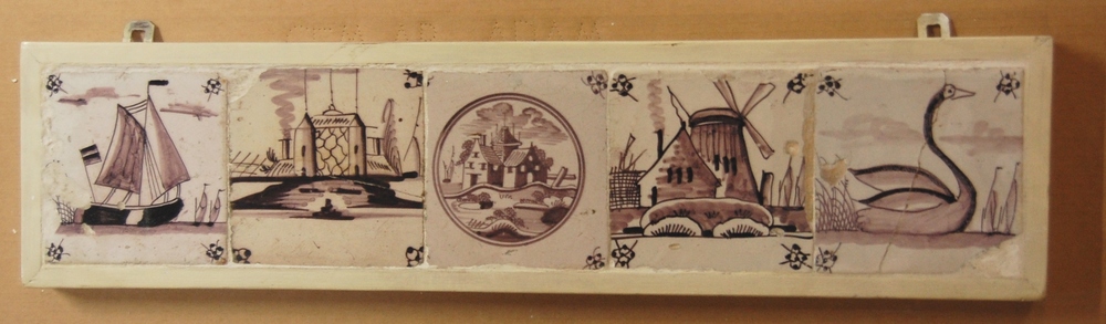 Tegelveld. Vijf paars gedecoreerde tegels op witte o...
