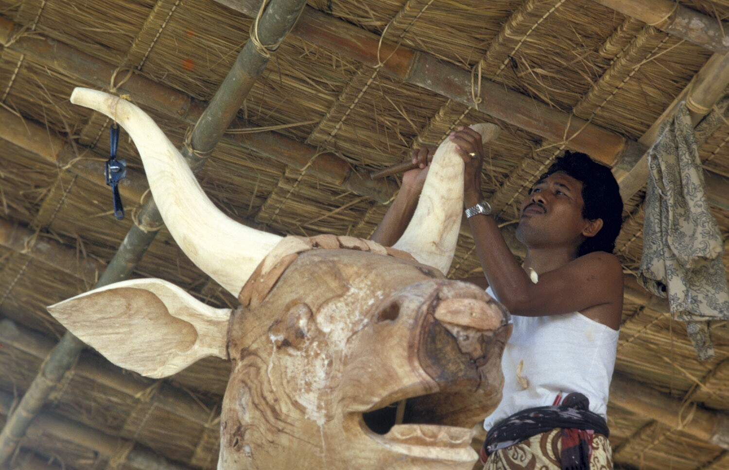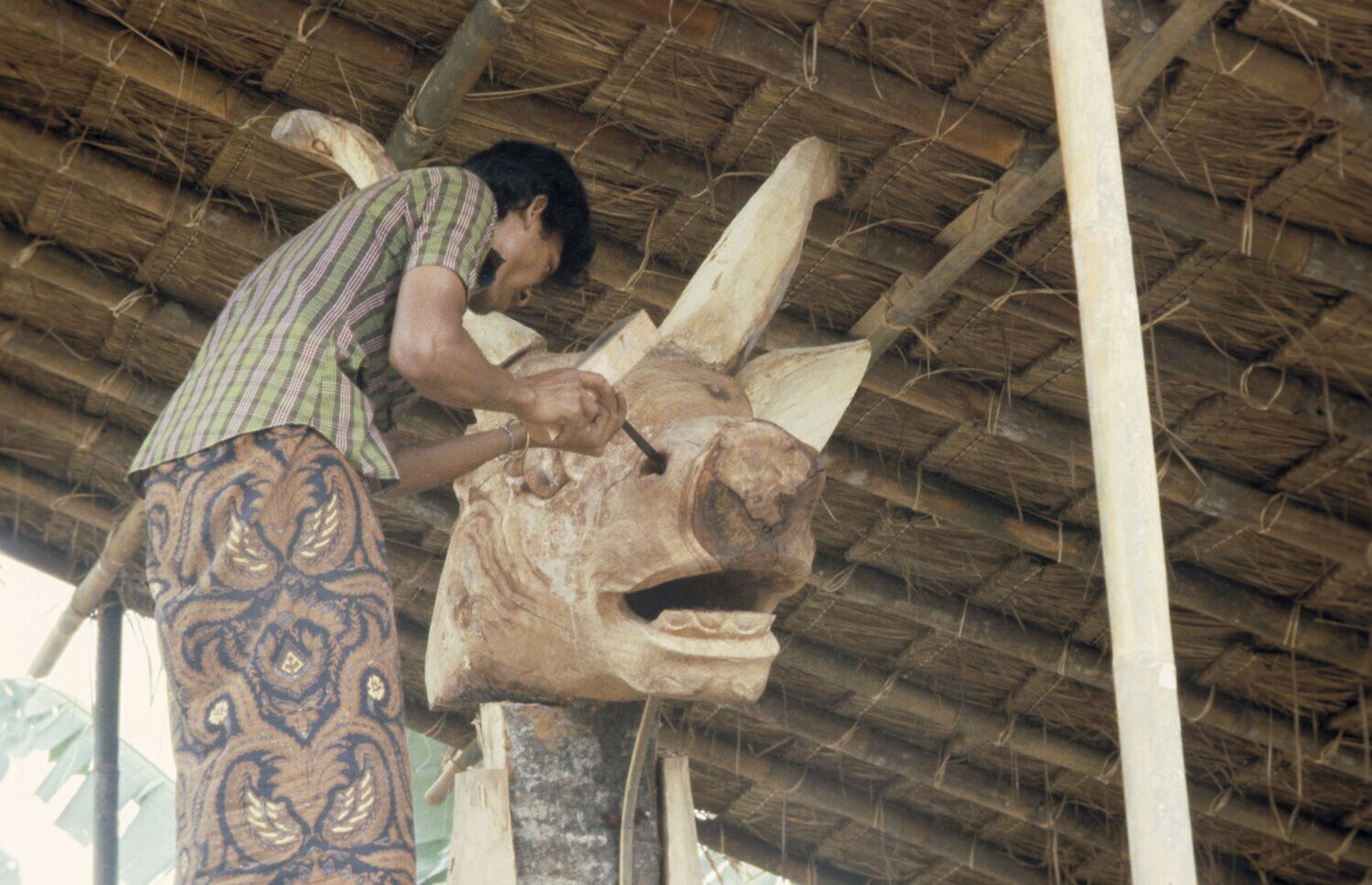 Portret van Ida Bagus Made tijdens het snijden van e...