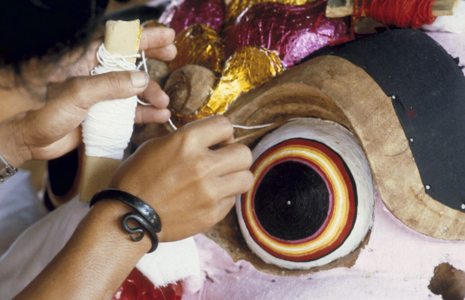 Houtsnijders tijdens de vervaardiging van een masker...