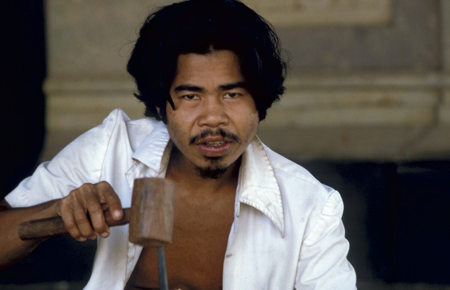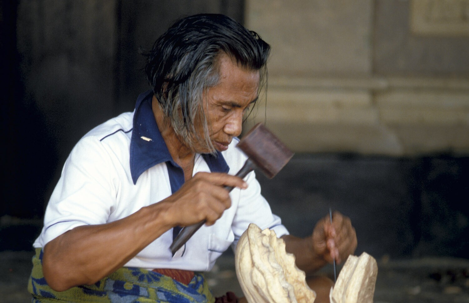 Portrait of a woodcarver at work for the cremation c...