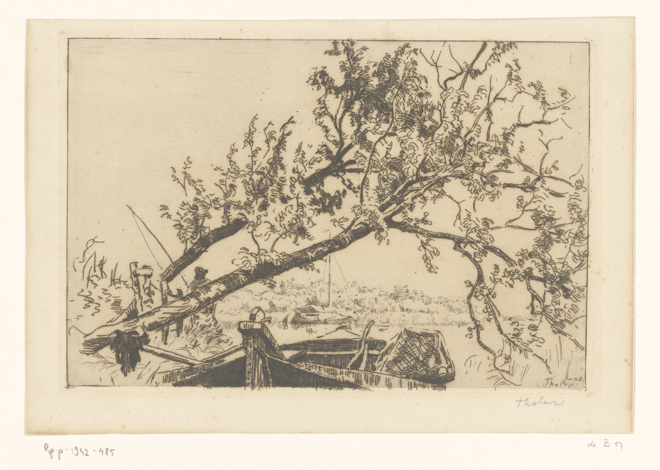 Landschap met omgevallen boom, boten en hengelaar