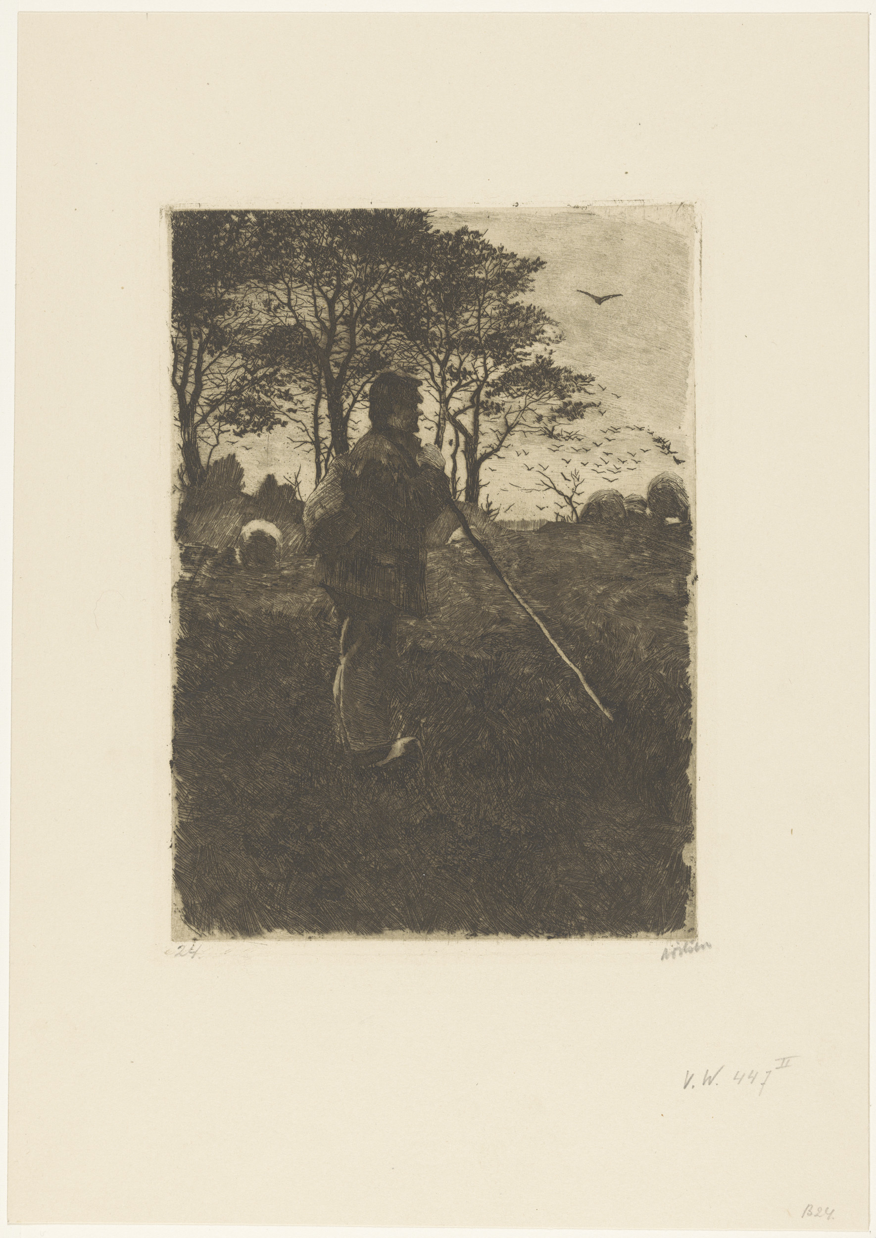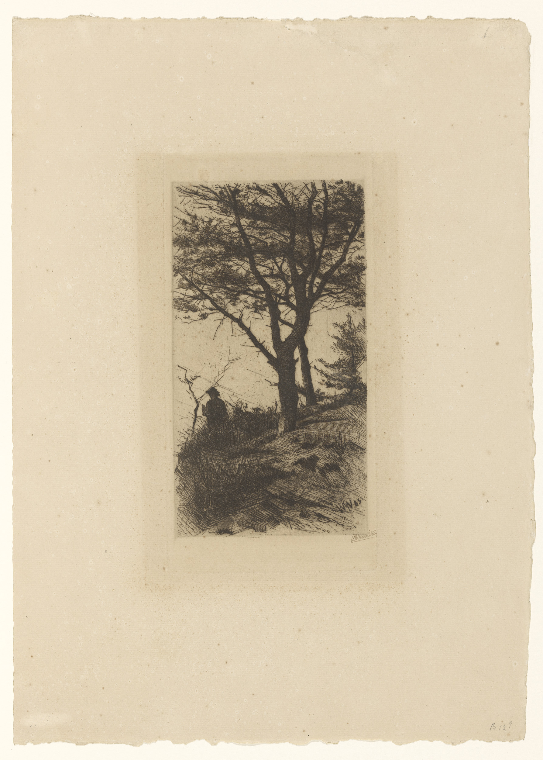 Bomen en een figuur op een heuvel