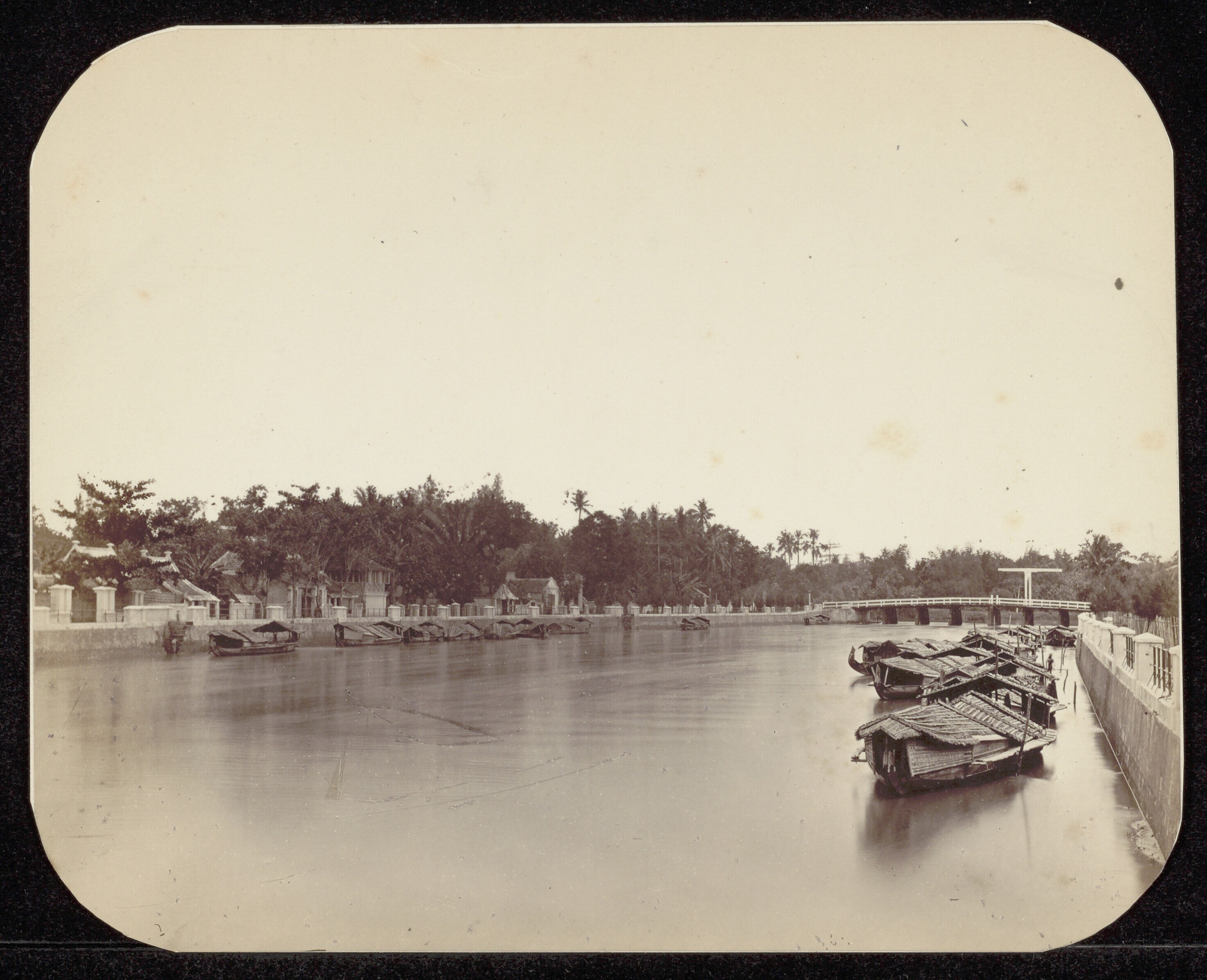 Prauwen bij de brug over de Kali Mas in de wijk Gent...