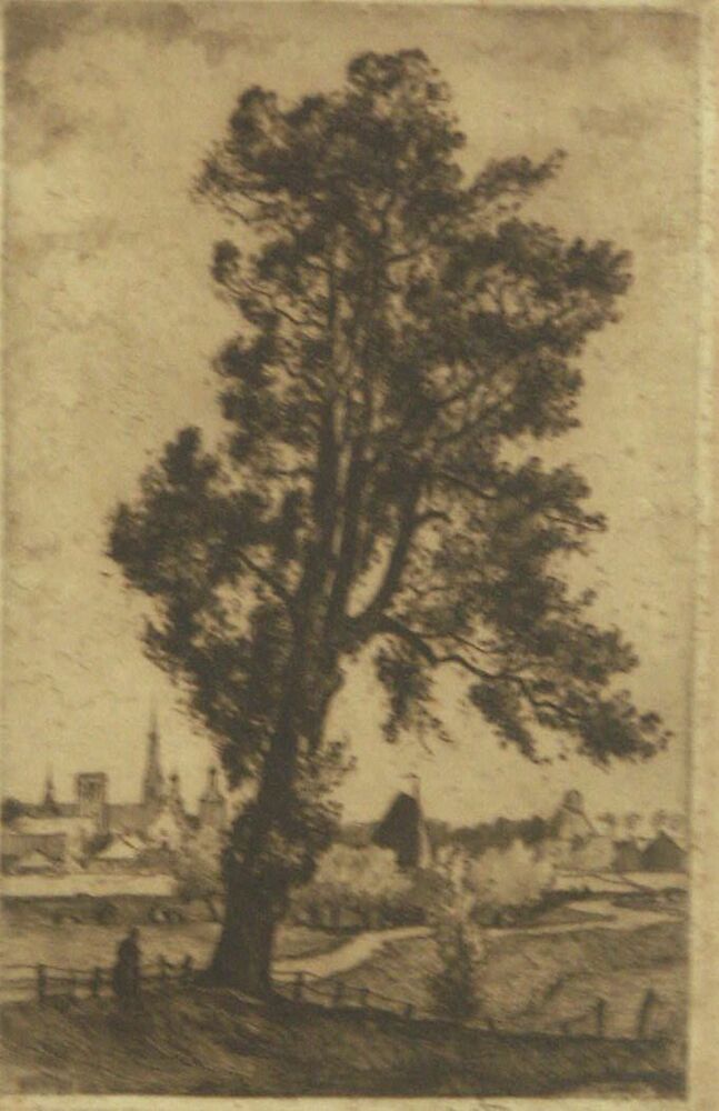 Ets, voorstellende gezicht op de dikke boom aan de o...