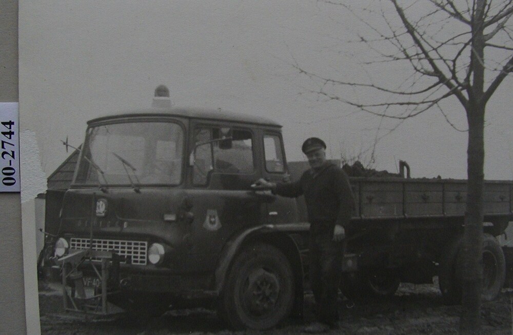 Antoon Demon met zijn vrachtwagen van de gemeente Hu...