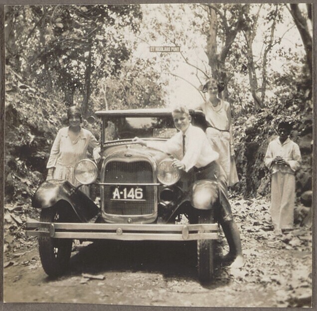 Portret van een gezelschap bij een auto