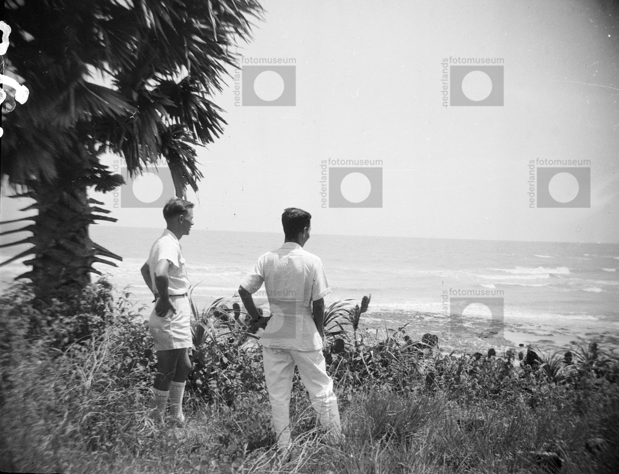 Mannen kijken uit over zee van Madura, Indonesië (1950)