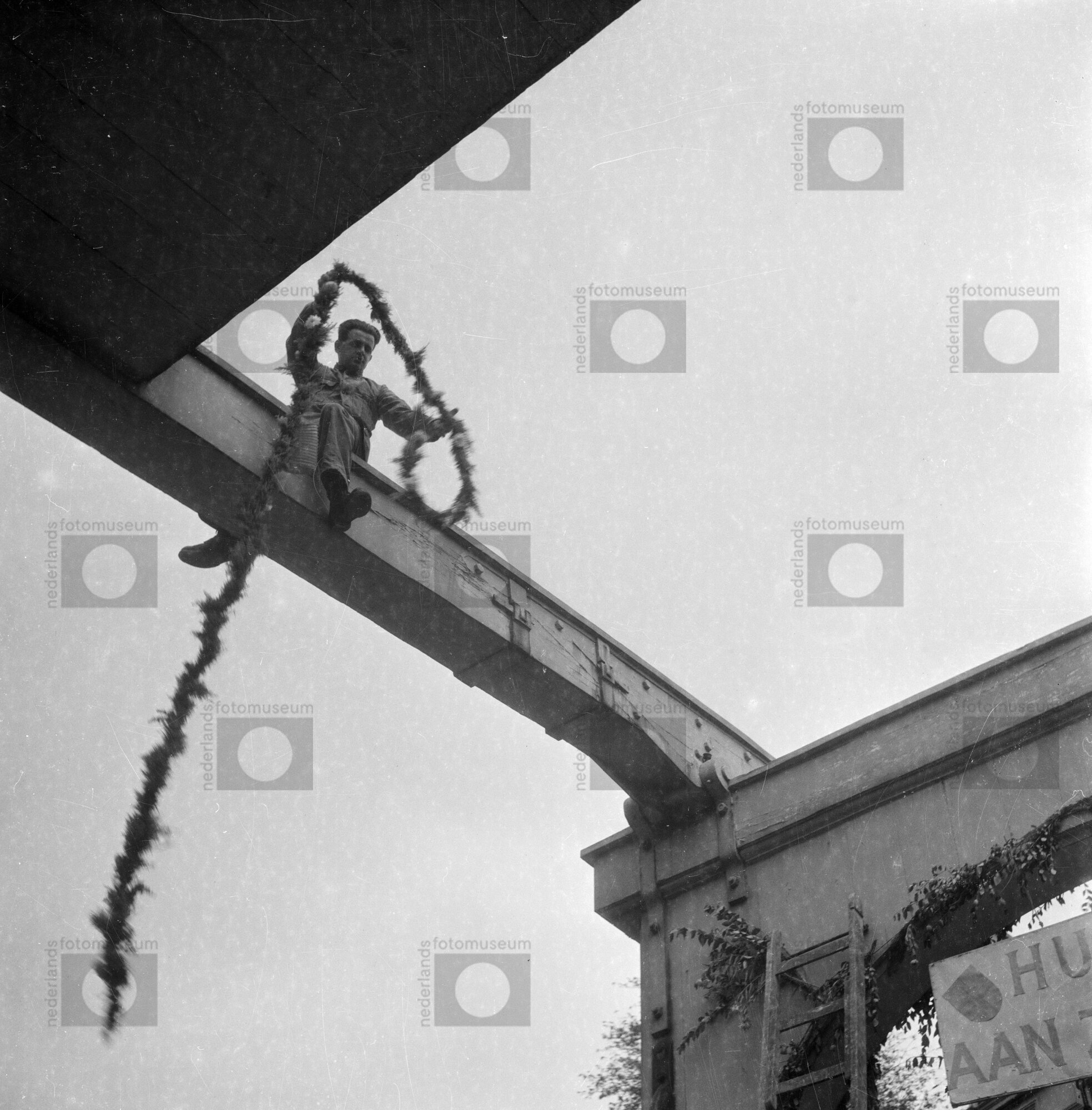 Man versiert ophaalbrug in Amsterdam (1945)