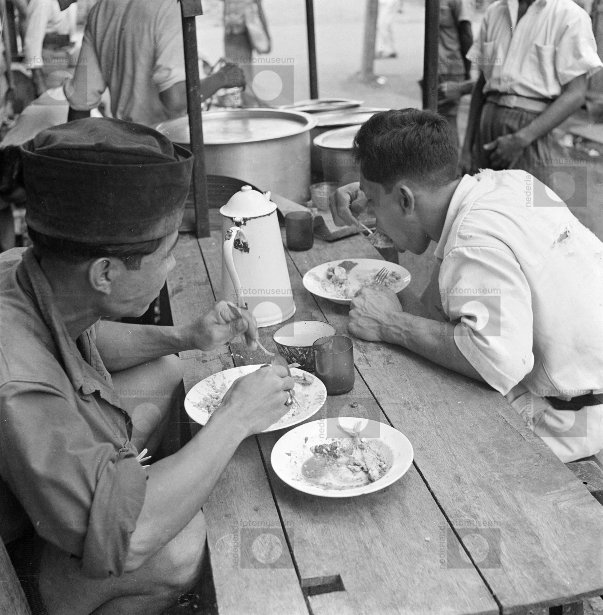 Twee mannen zitten aan een tafel te eten, Indonesië ...