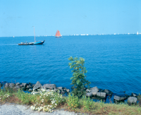 Schepen op een Randmeer. In de verte veel witte zeil...