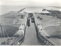 Schutsluis Den Oever in bedrijf; bedieningshuis in a...