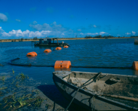 Schip trekt een calamiteitennet door het water.