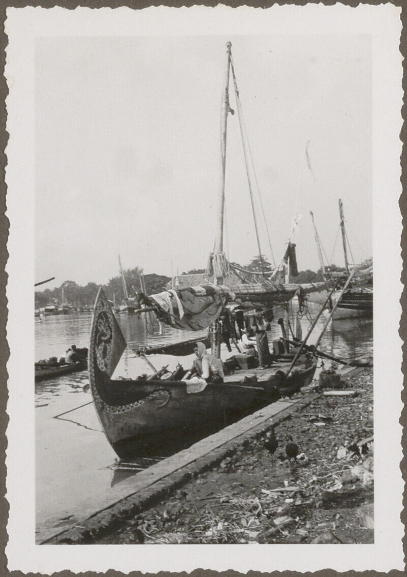 Zicht vanaf de pier op een prauw en sloep nabij Pasa...