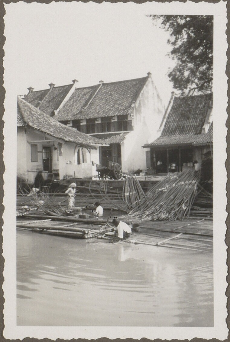 Twee mannen lopen over vlotten van bamboestammen