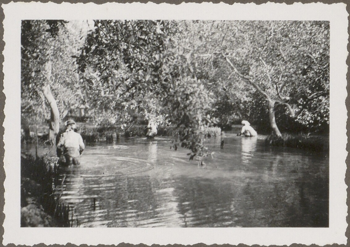Drie mannen vissen in de mangrove nabij Selabintana