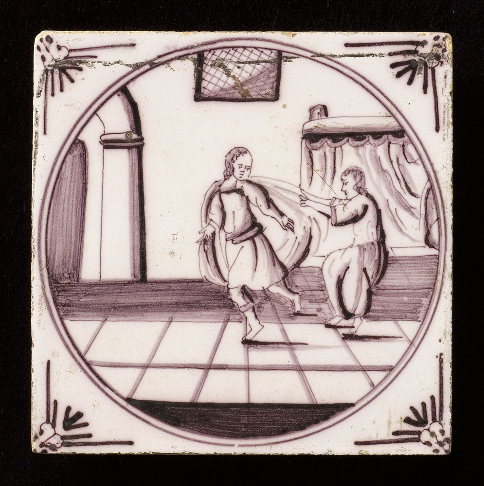 Tegel van keramiek met tinglazuur, voorstellende: Po...
