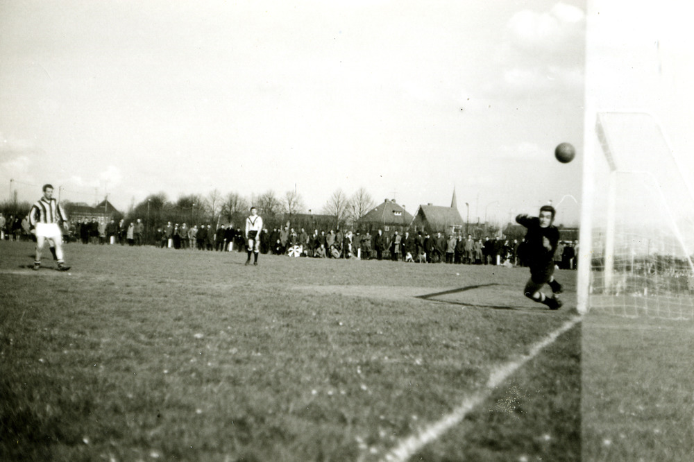 Zwart-wit foto van de voetbalwedstrijd van DES tegen...