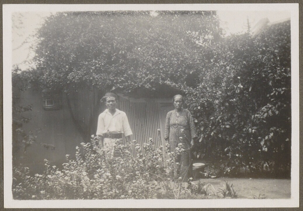 Twee leden van het huispersoneel in de tuin, waarond...