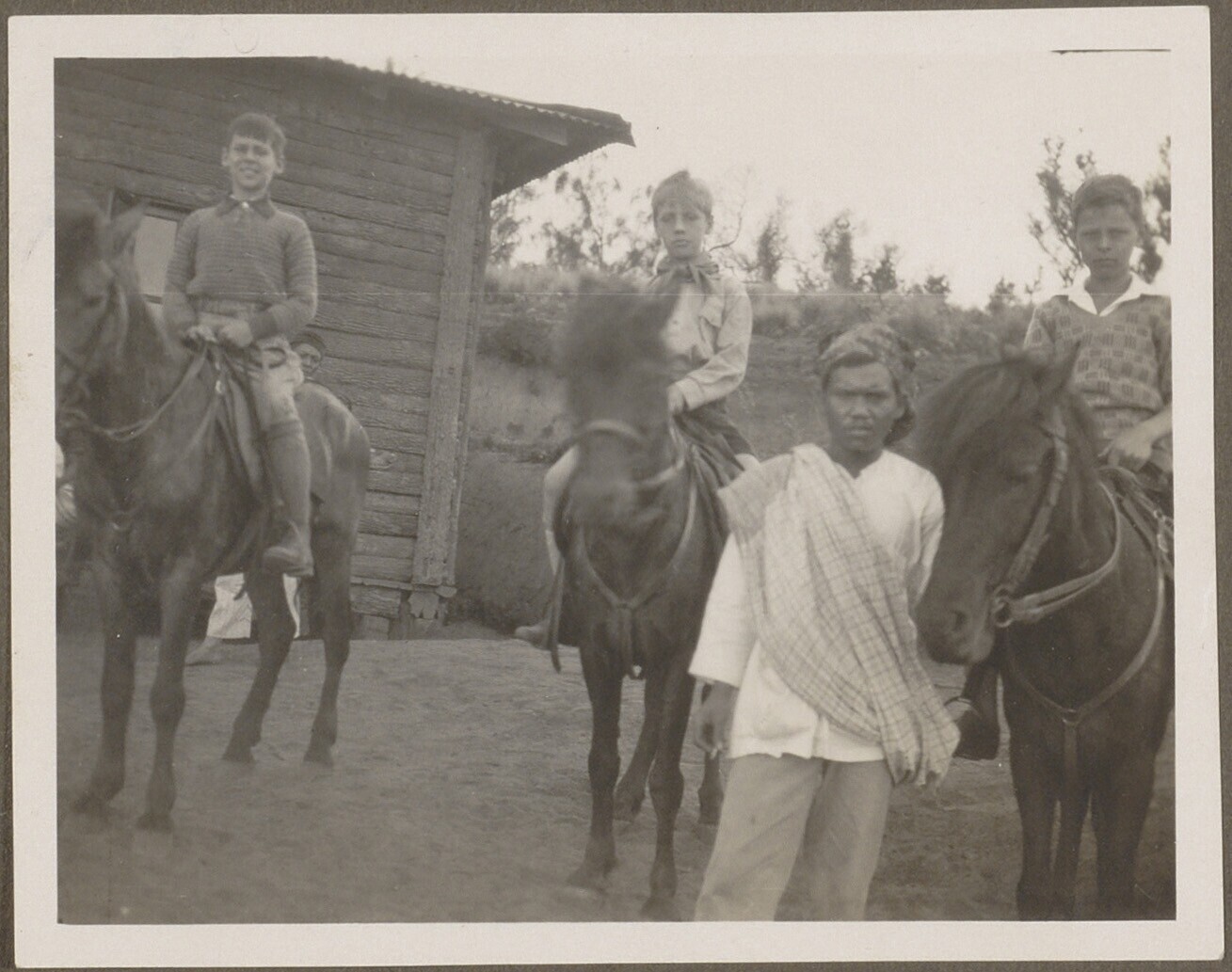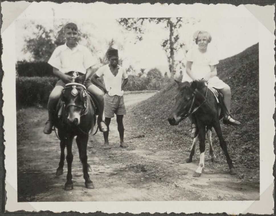 Javaan naast jongen op een ezel en meisje op een pony