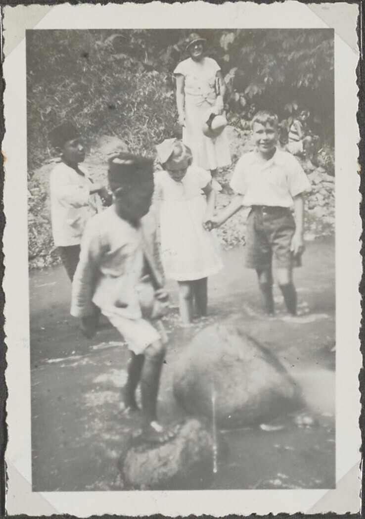Javaanse en Europese kinderen steken een rivier over