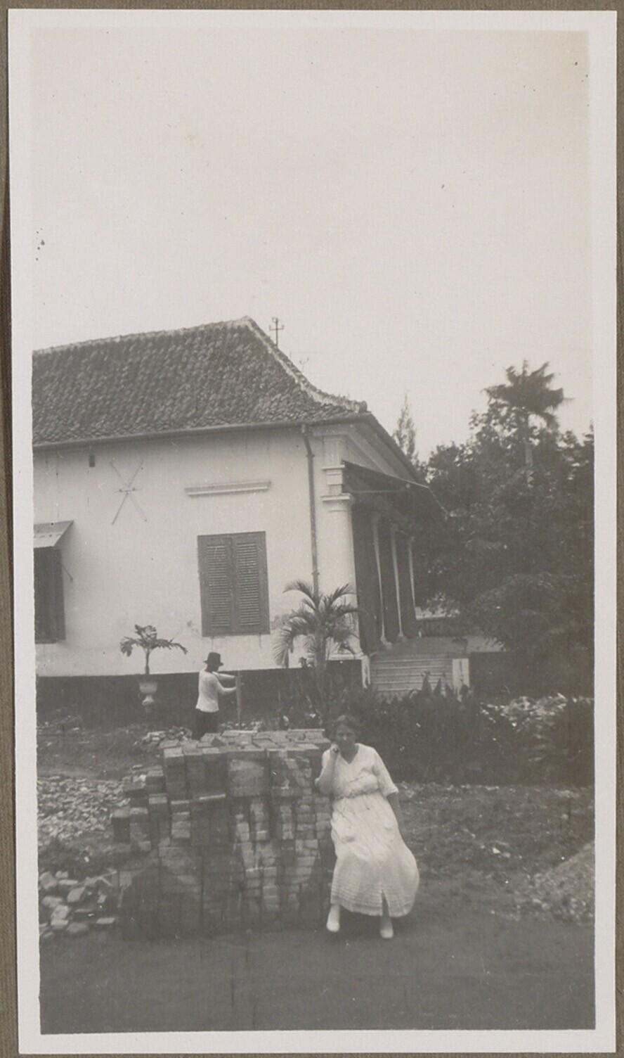 Vrouw zit op een stapel tegels op het erf