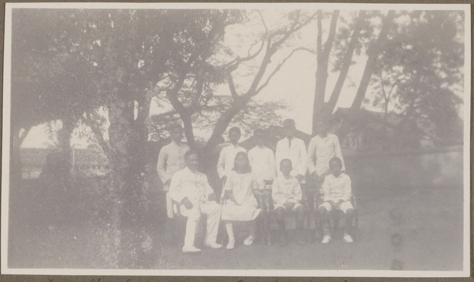 In de tuin genomen klassenfoto van een gemengde klas...