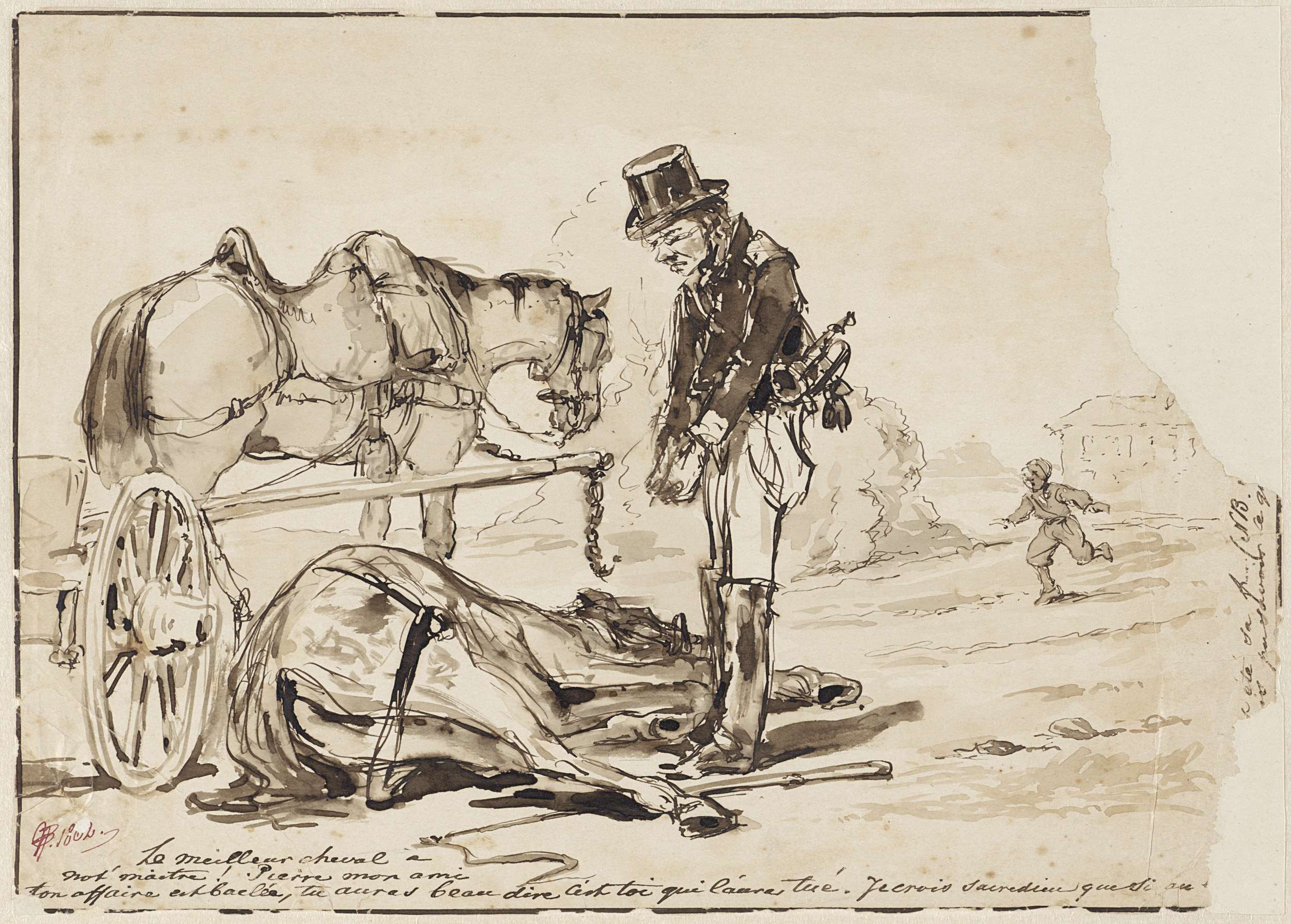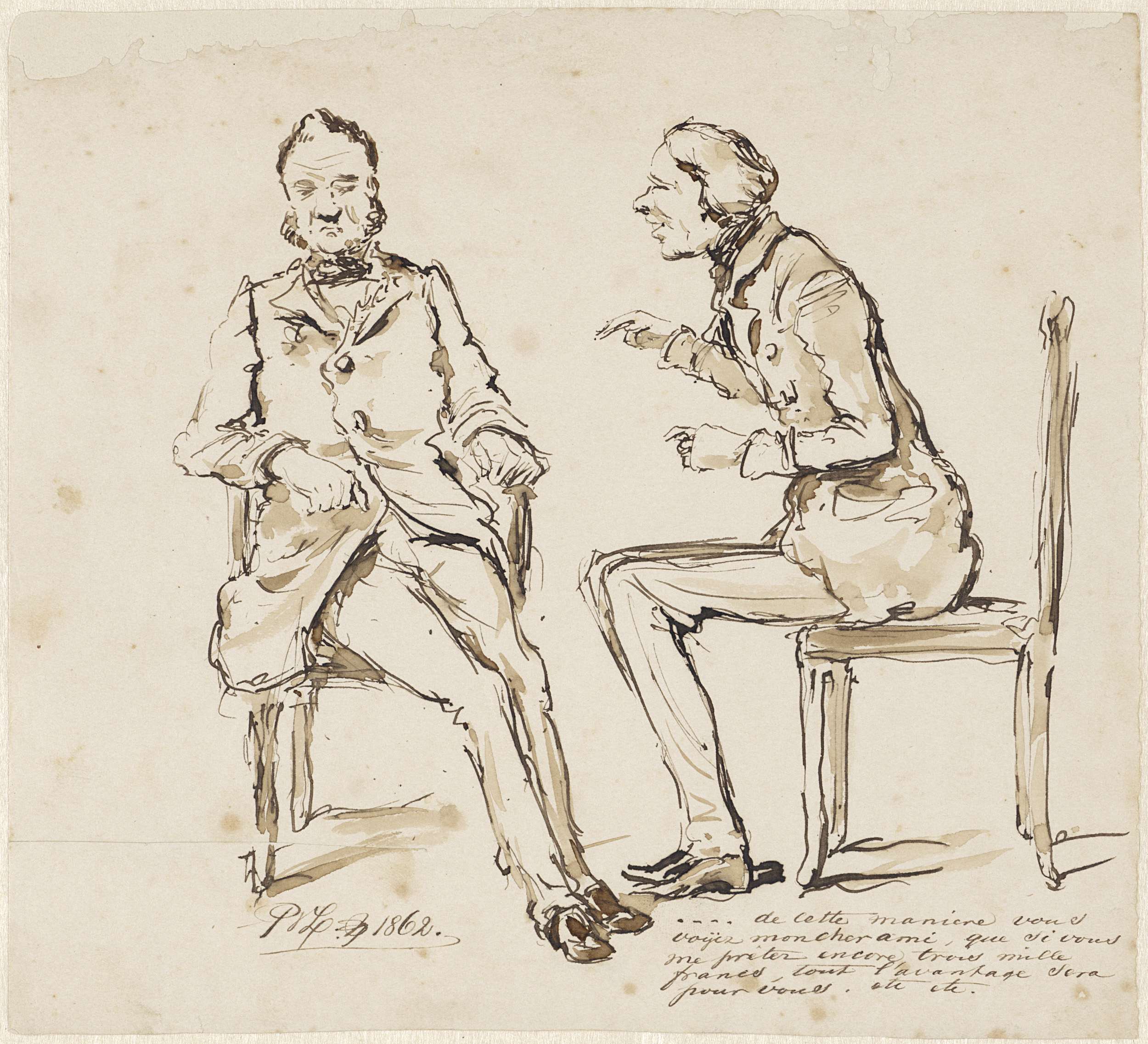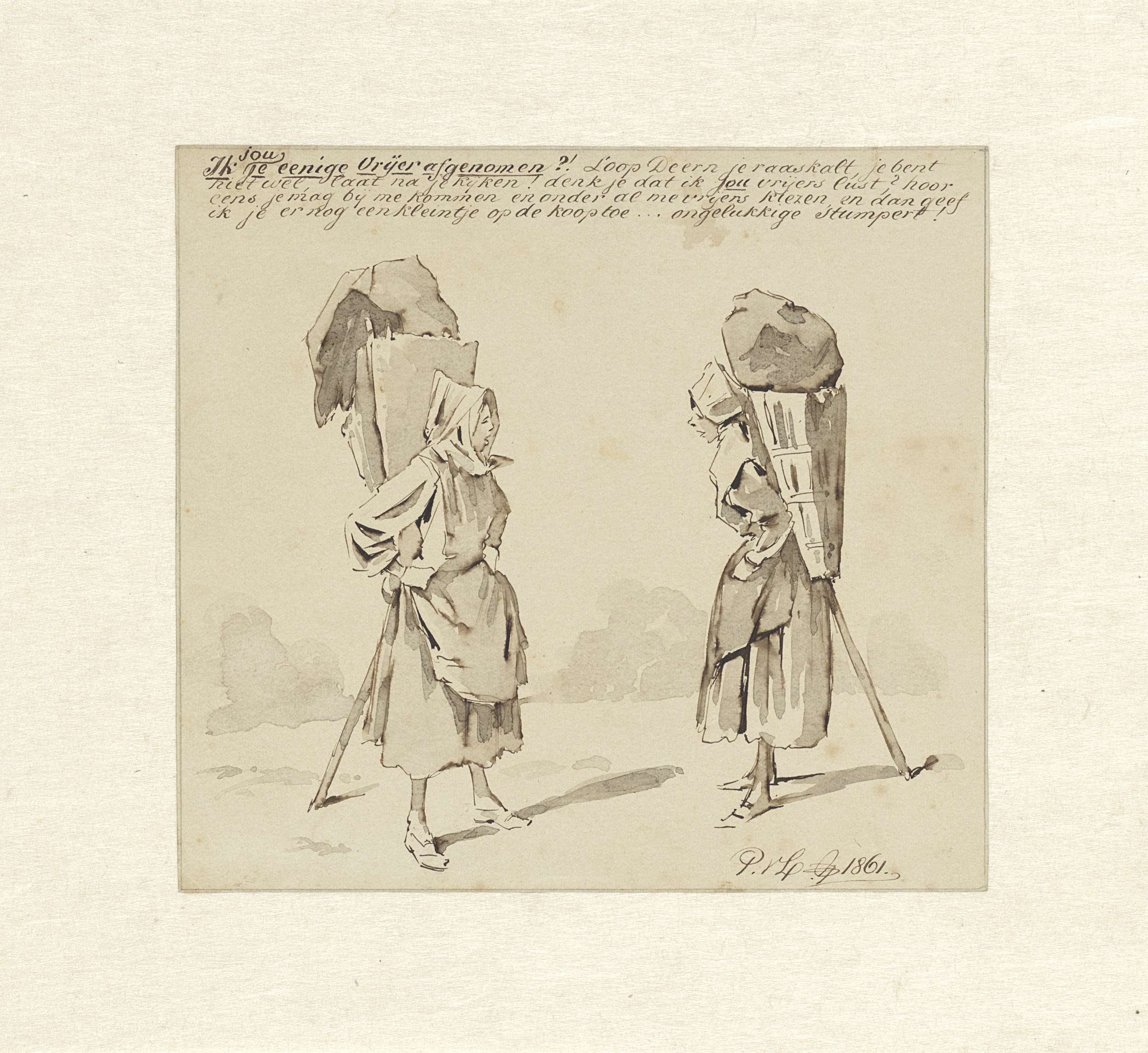 Karikatuur van twee om een vrijer kijvende marktwijven