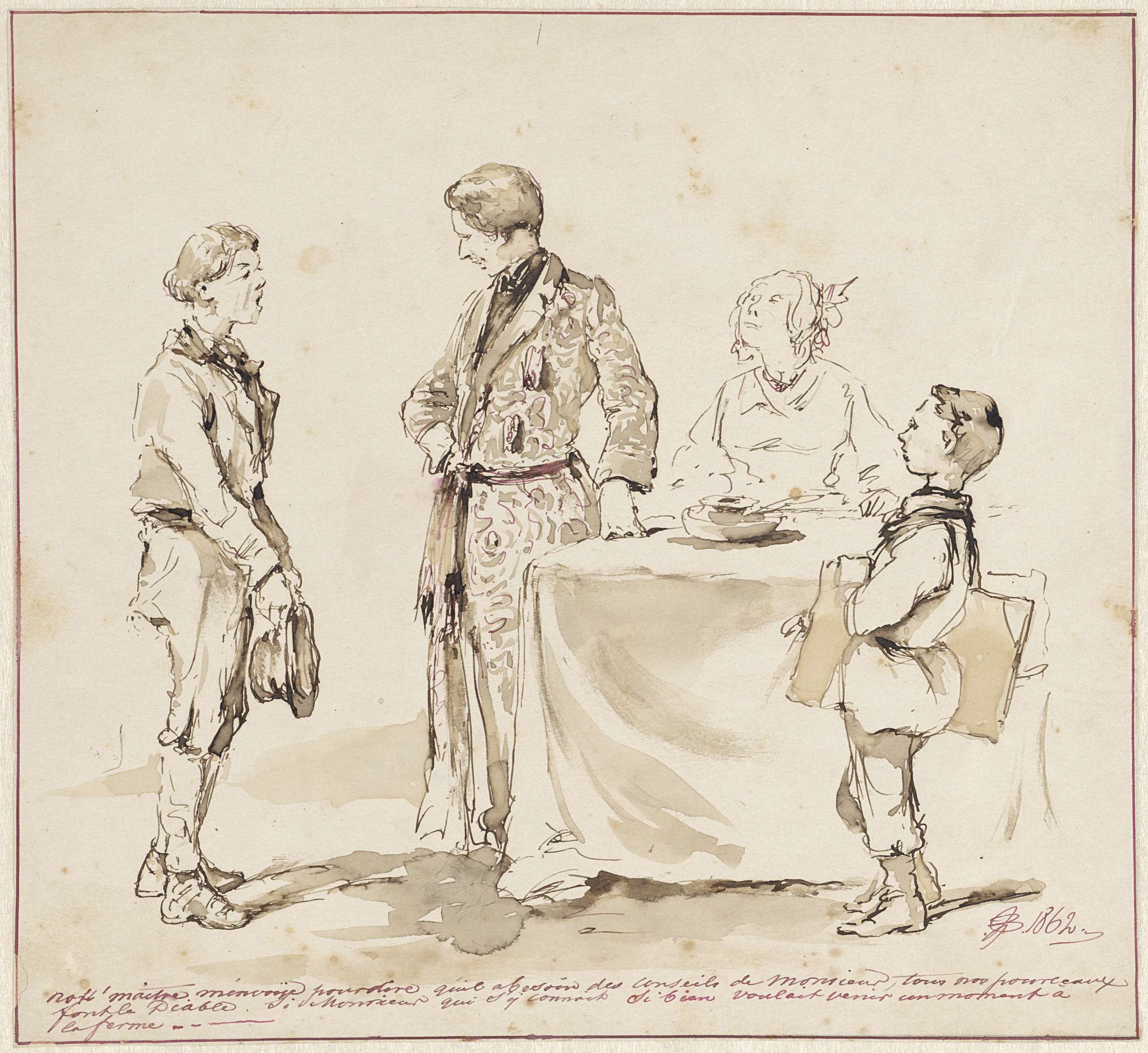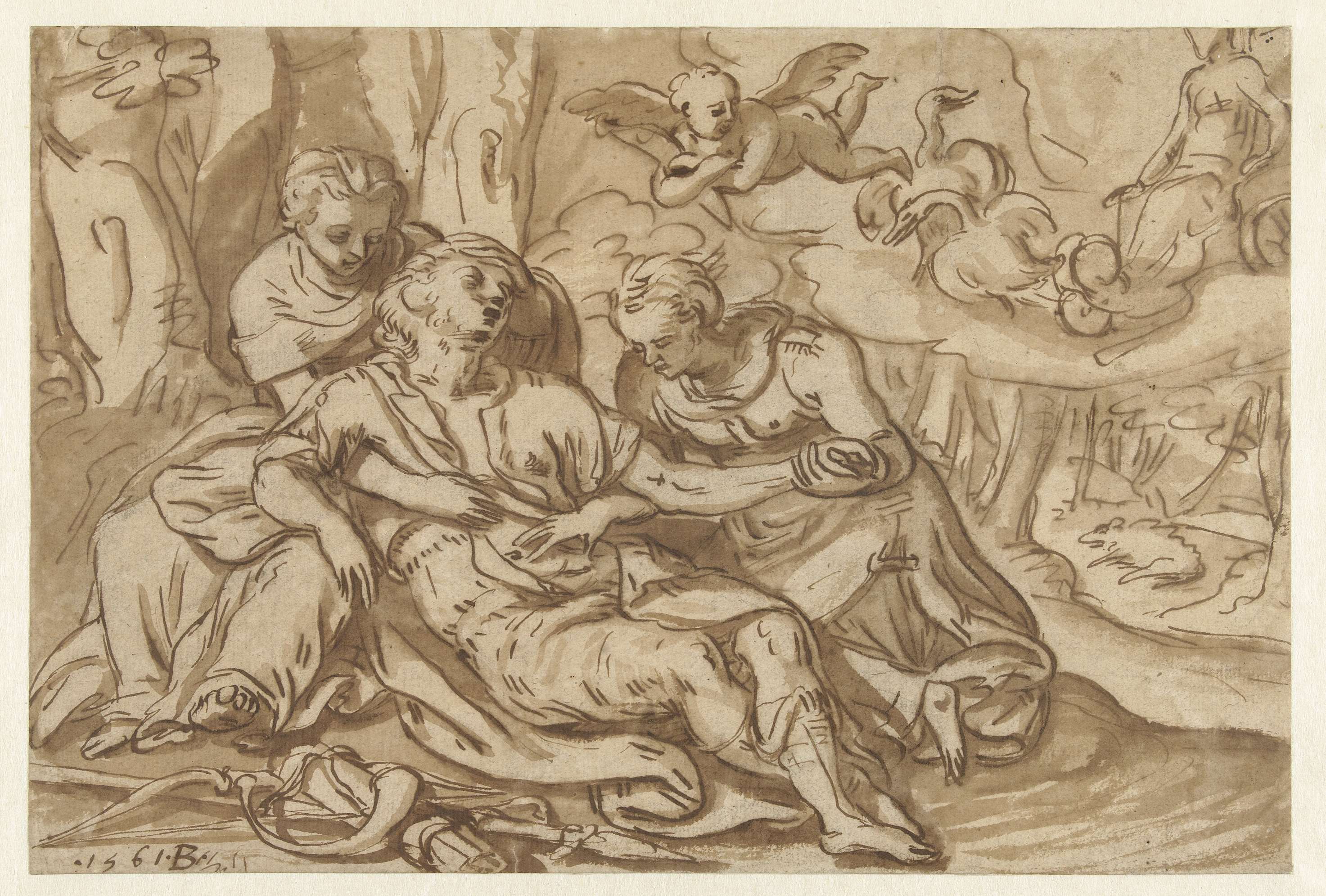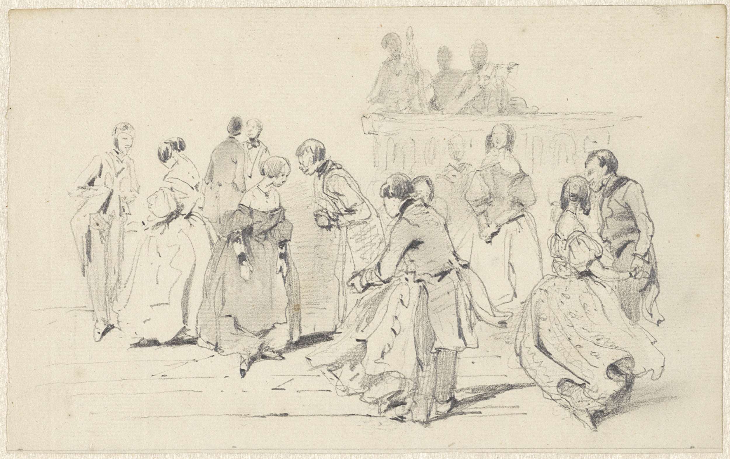Karikatuur van twee om een vrijer kijvende marktwijven