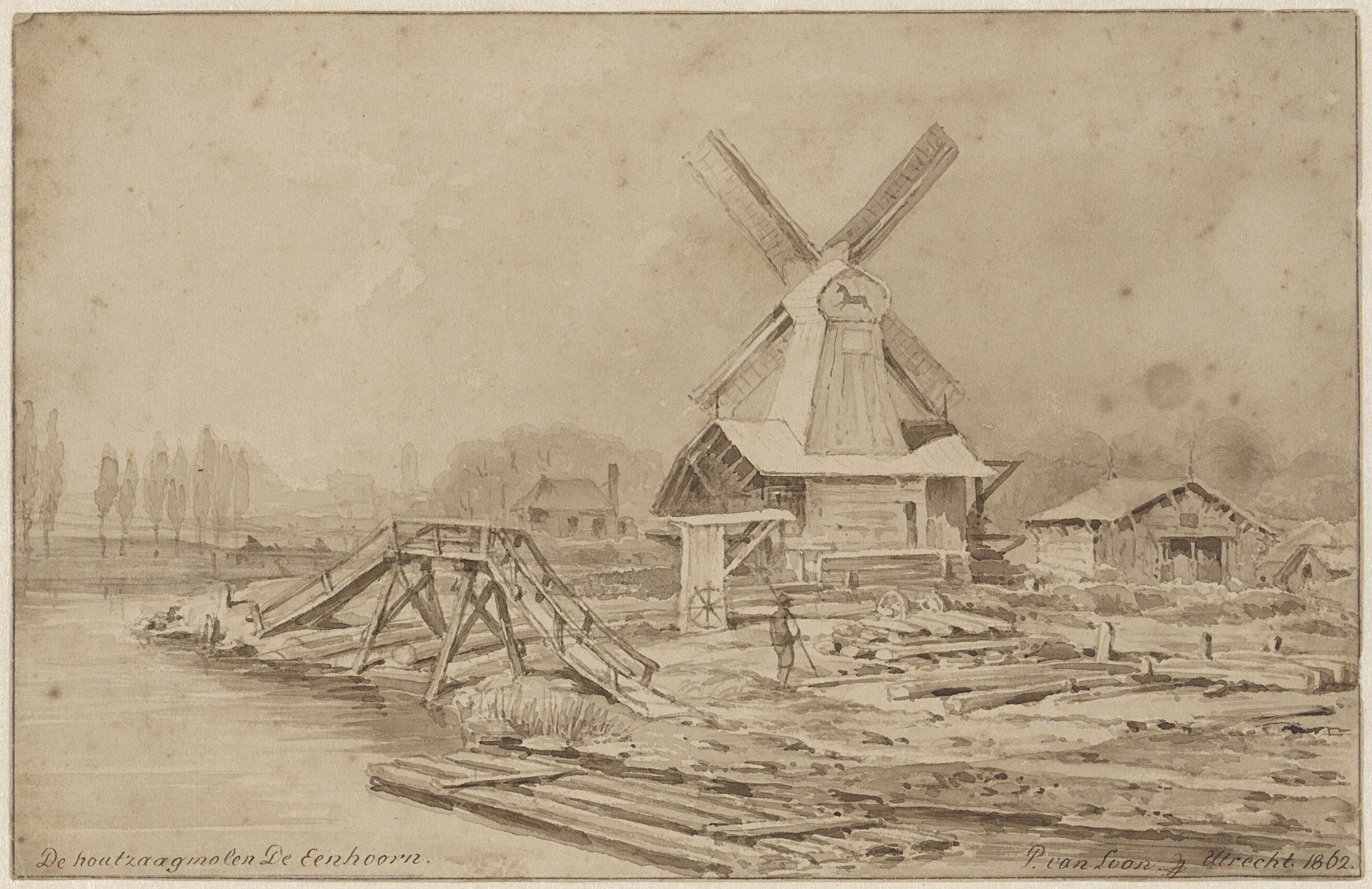 Gezicht op de houtzaagmolen De Eenhoorn bij Utrecht