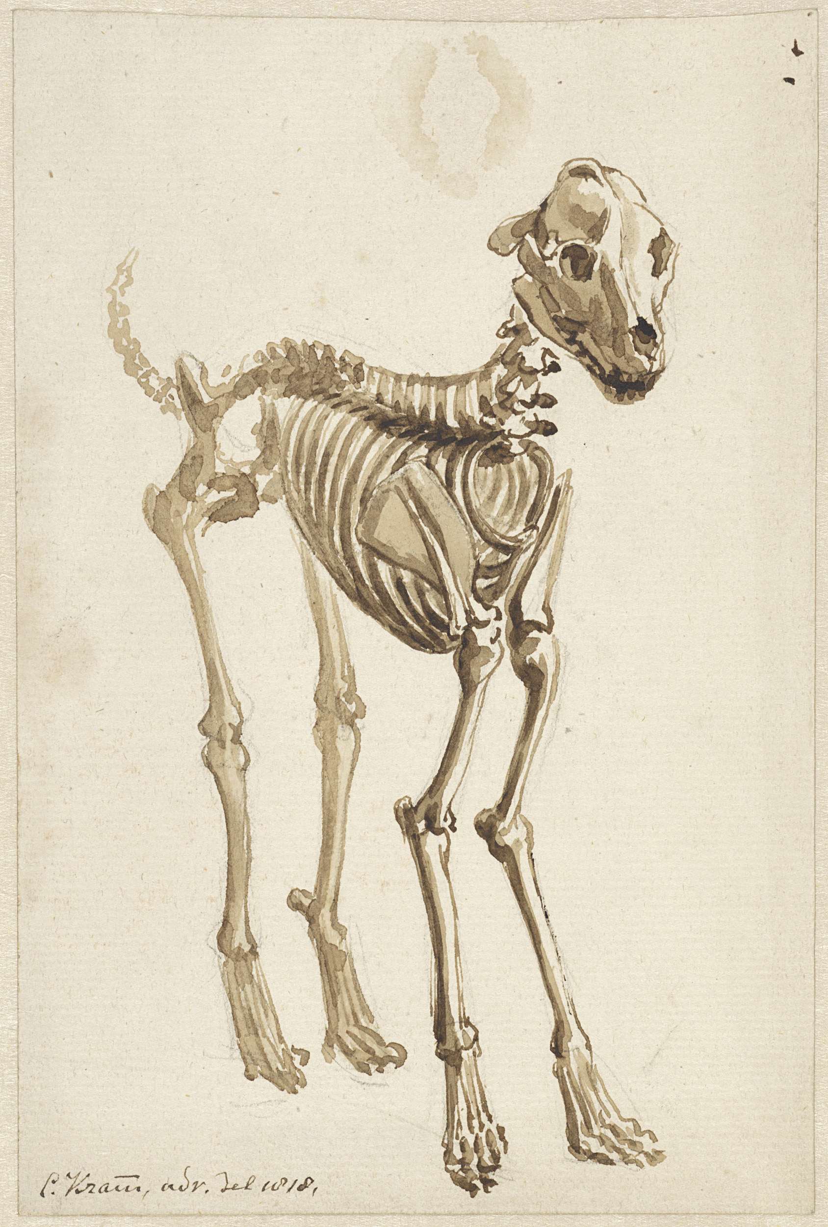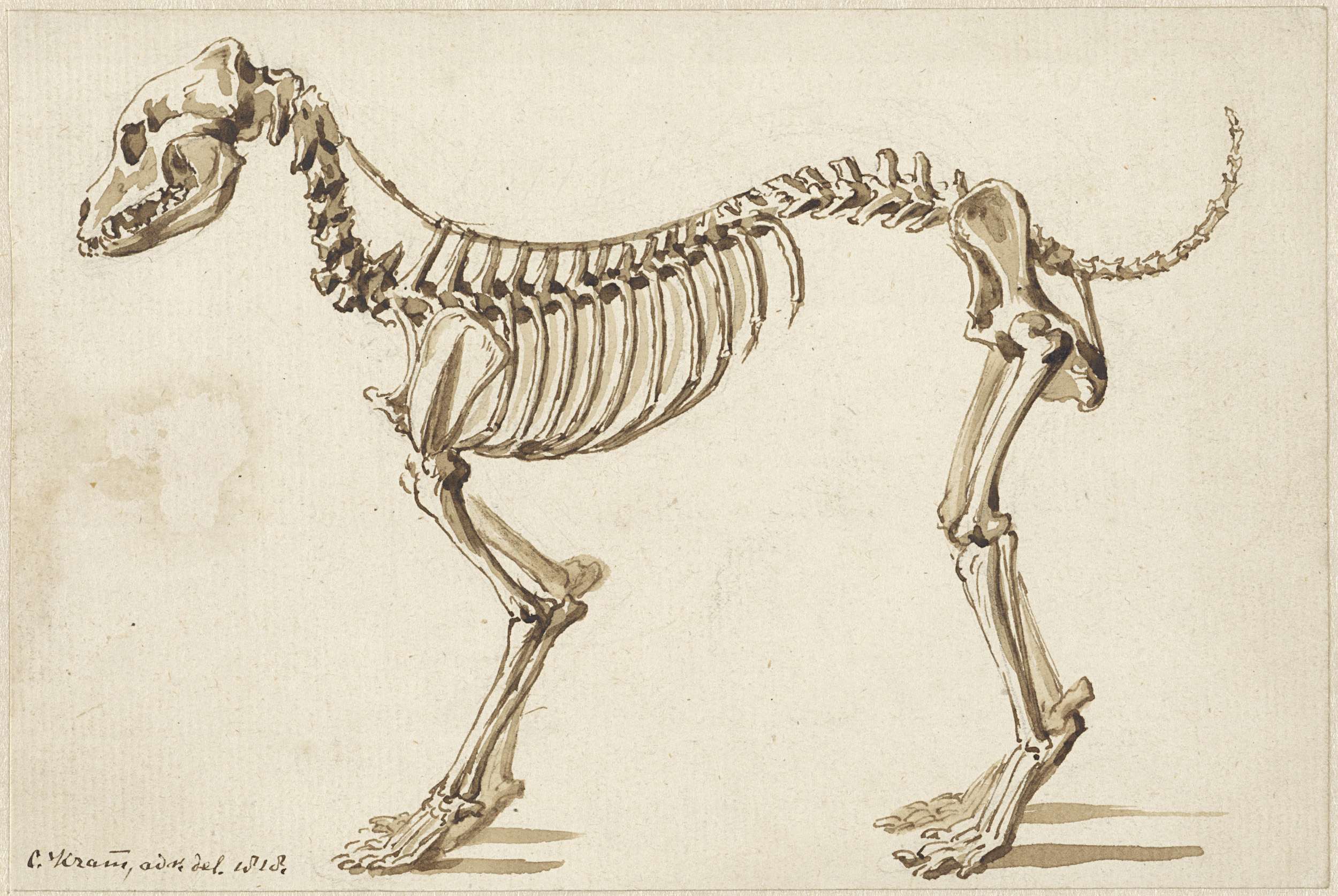 Het skelet van een hond, schuin van voren