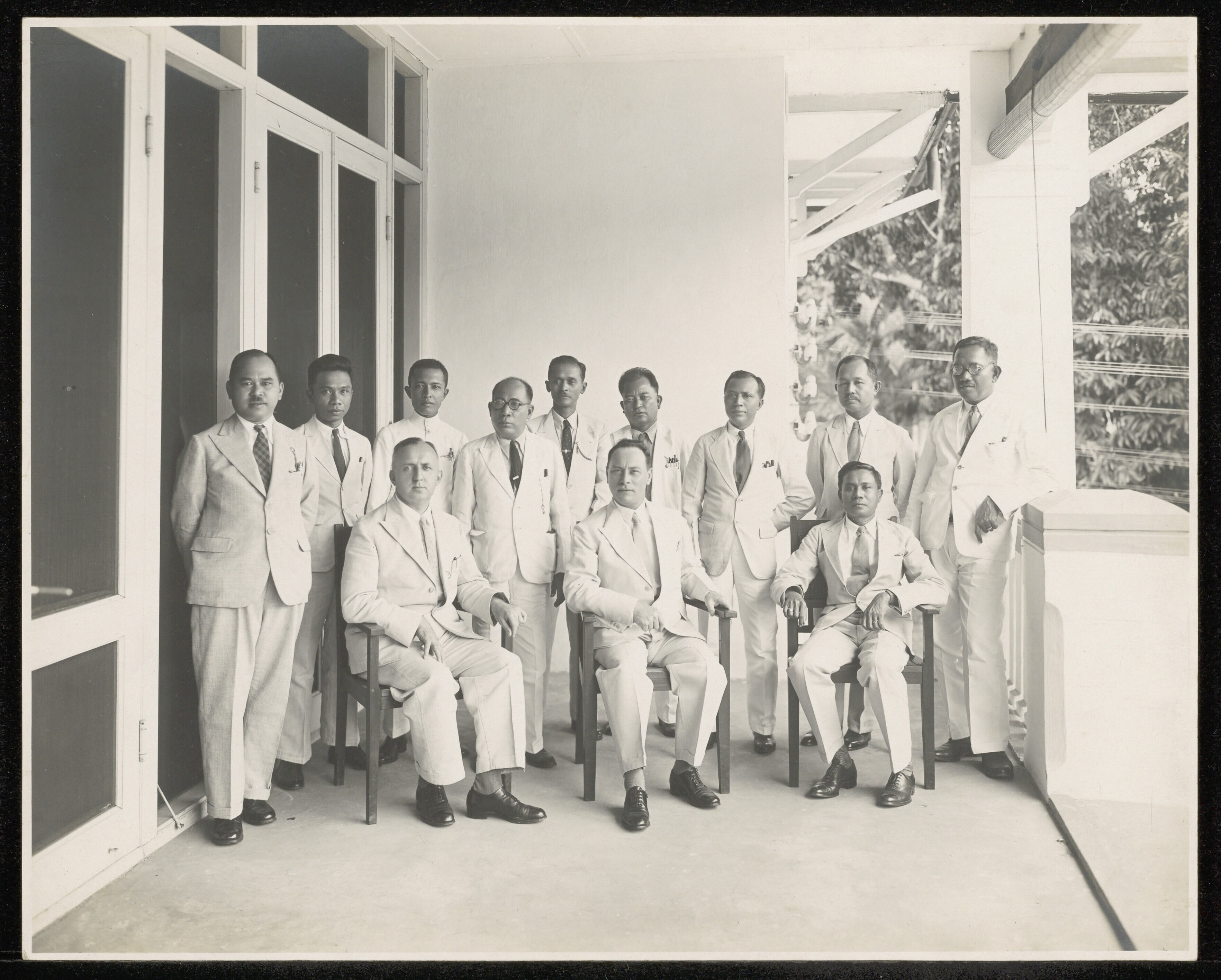 Groepsfoto, centrale figuur is Dr. Essed omringd doo...