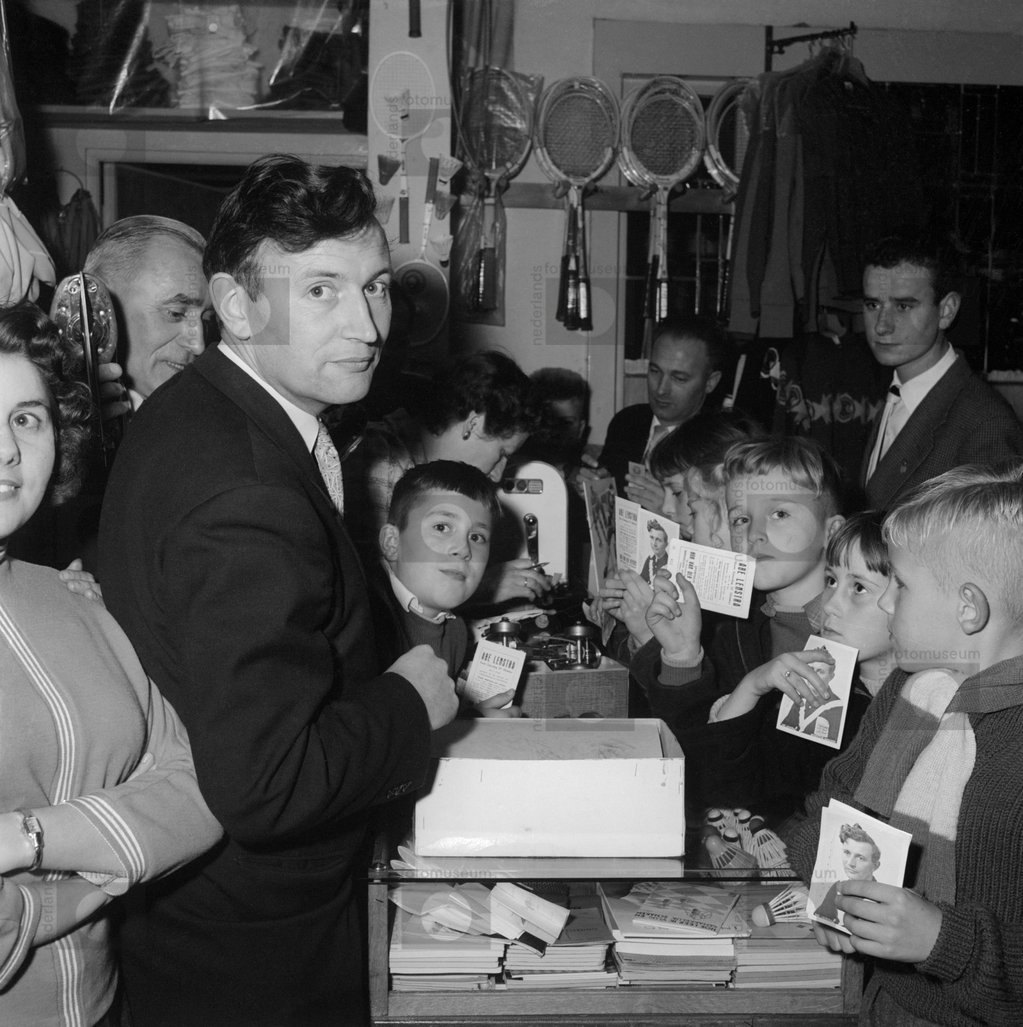 Abe Lenstra met jonge fans in een sportwinkel, Rotte...