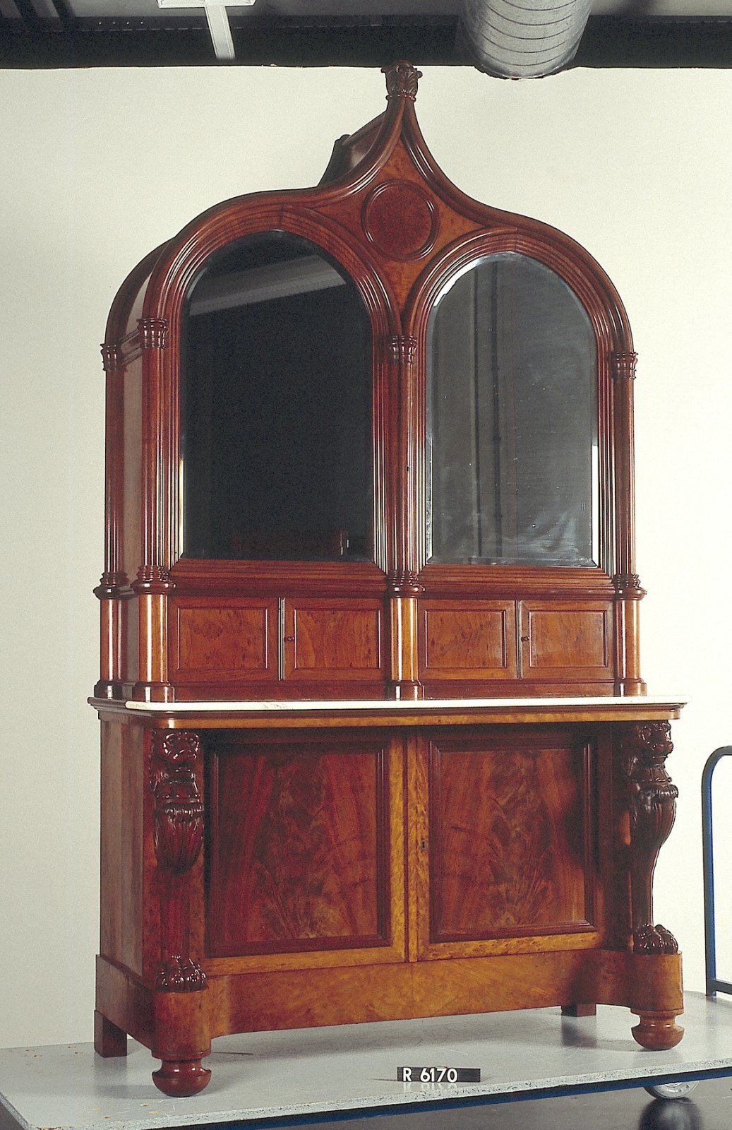 diverse houtsoorten belijmd met padoek- en cederhout, versierd met beschilderde wit marmeren plaquettes (1)