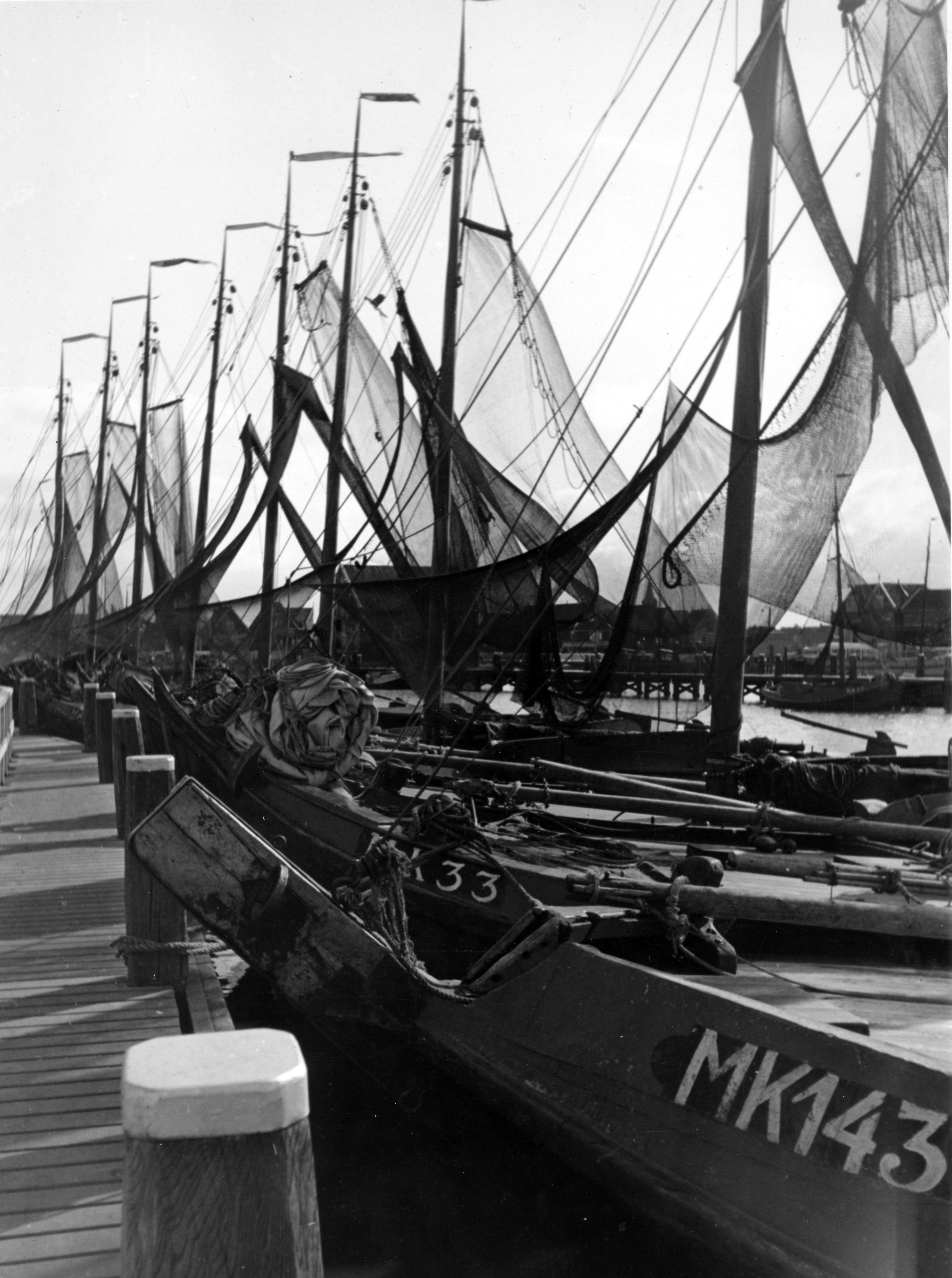 Vissersboten in de haven, Marken, 1943 (zwart-wit foto)