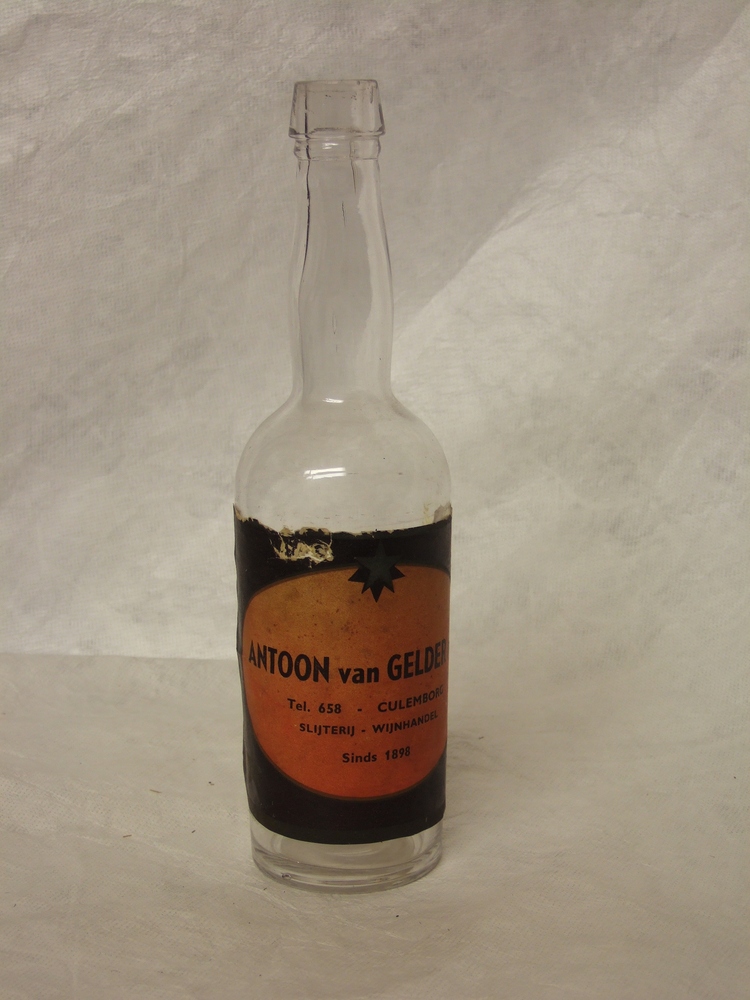 fles van kleurloos glas met etiket, geassocieerd met...