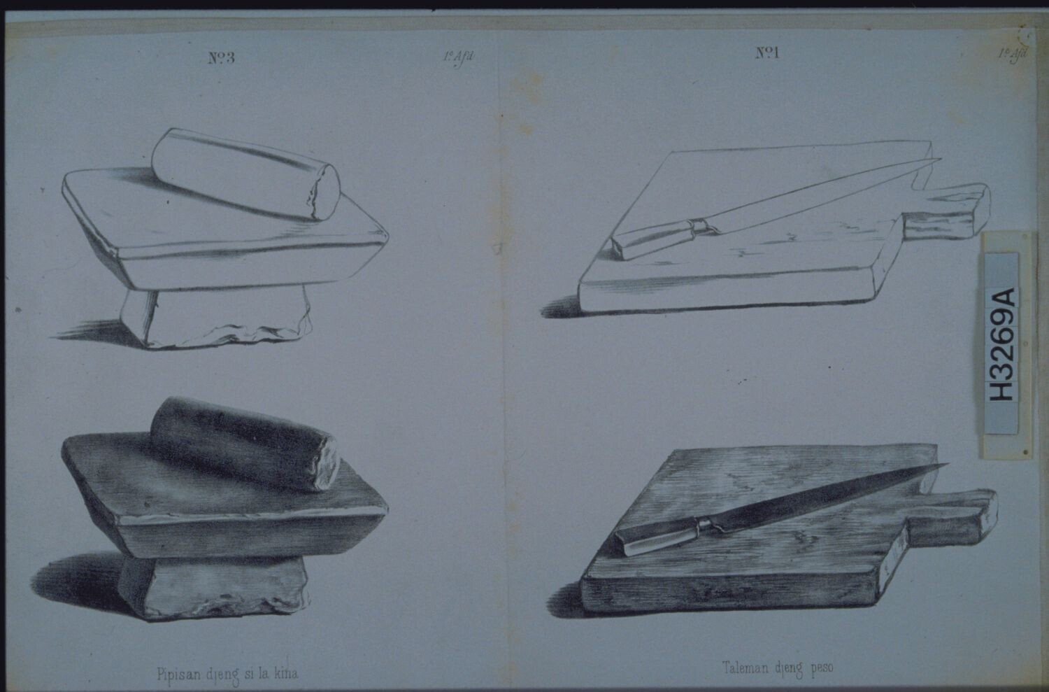 Een maalsteen (no 3) en een snijplank met mes (no 1)