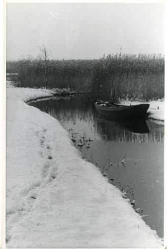 Foto van een roeiboot in een halfbevroren slootje do...