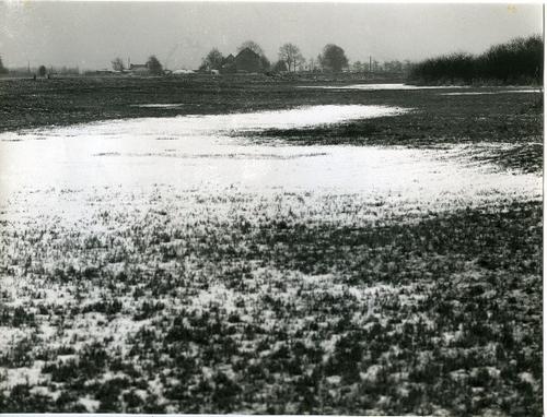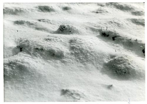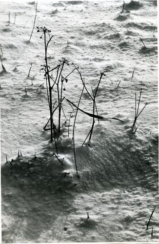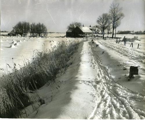Foto in zwart-wit van een besneeuwd weiland door J.D...