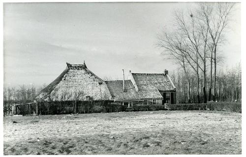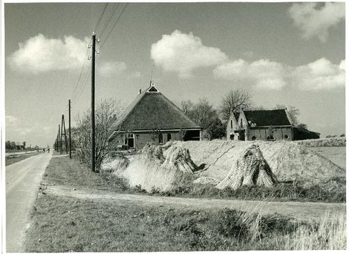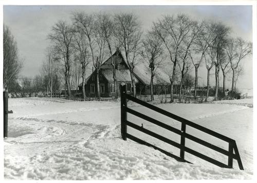 Foto in zwart-wit van een boerderij met erf in de sn...