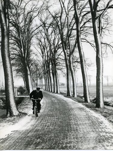 Foto in zwart-wit van een postbode op een winterse w...