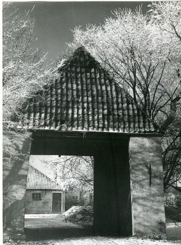 Foto in zwart-wit van een poort bij een boerderij do...