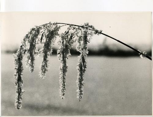 Foto in zwart-wit van een berijpte rietpluim door J....